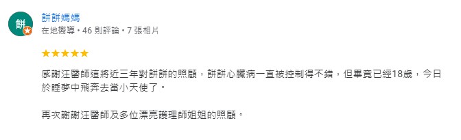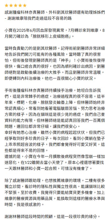 謝謝維康醫院的高嘉蓮醫師跟劉醫師還有醫助們,謝謝你們曾經這麼細心和溫柔的救治我們Dona,雖然知道淋巴癌的治療也只能讓Dona再支撐6-12個月,也知道抗癌需要花很多的金錢跟心力去照顧,儘管很心力交瘁我跟我老公還是不願意放棄,積極的治療了一陣子後,經濟方面開始有一點緊繃,謝謝高醫師那時候幫我們想了很多適合的方案後也比較沒那麼壓力,在去年8/23的時候Dona很突然的離開了我們,真的非常難過….. 但後來想想或許也是好事,最後的治療效果變差了,Dona身體狀況急劇下降,祂也很痛苦的撐著陪伴我們,離開對祂也是種解脫了….. 謝謝高醫師在Dona離開4個多月後,還特地做了張有Dona照片的明信片,而且還是手寫的內容,真的非常非常非常的感動,謝謝妳高嘉蓮醫師,謝謝妳在Dona抗癌最後那段的時間裡,這麼細心和耐心的替祂治療!